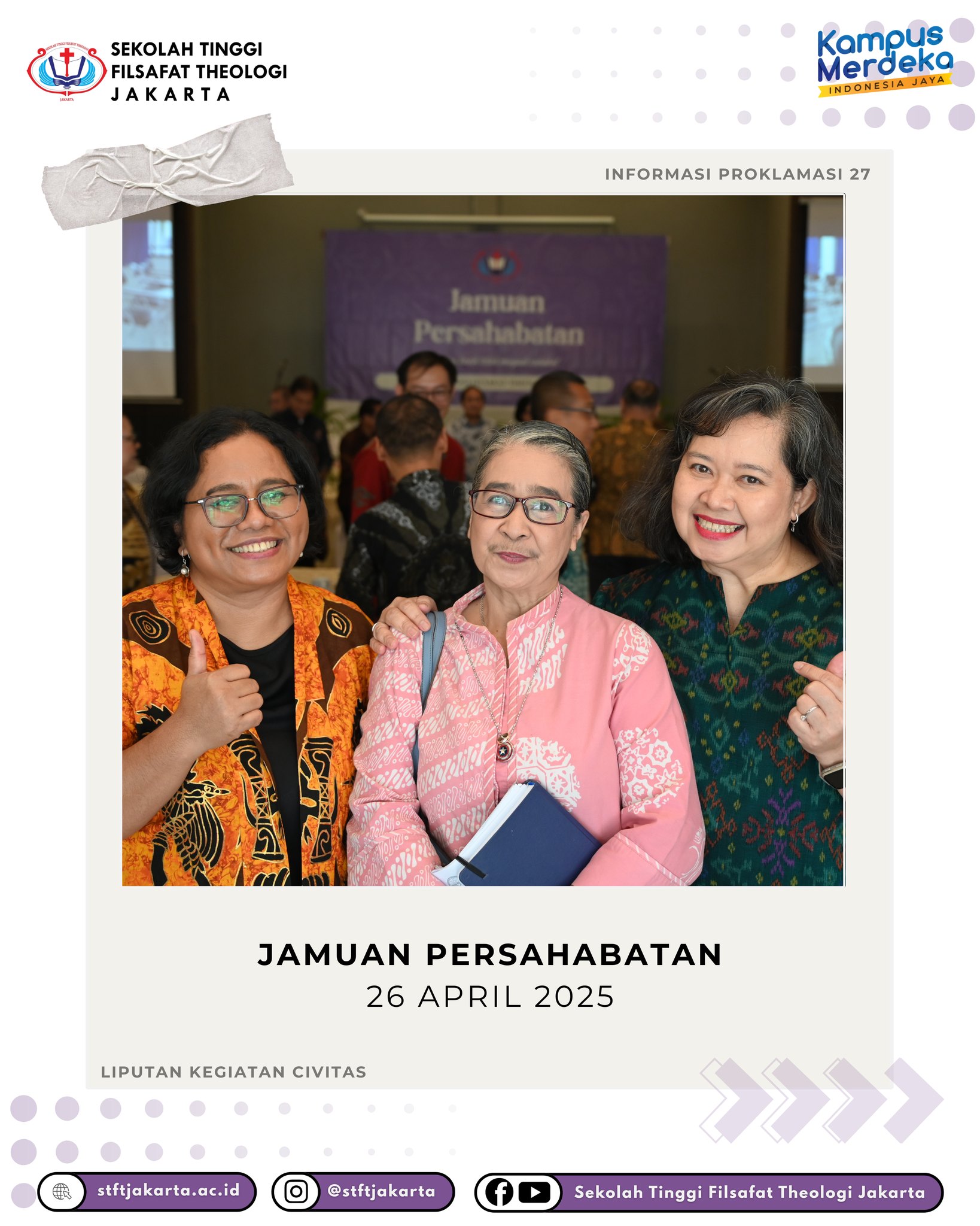 Pada Sabtu, 26 April 2025, Sekolah Tinggi Filsafat Theologi (STFT) Jakarta mengadakan Jamuan Persahabatan di Aula Lantai 1 Kampus STFT Jakarta. Kegiatan ini menjadi momen penting untuk mempererat tali silaturahmi dengan gereja-gereja mitra dan sahabat yang telah setia menopang pelayanan STFT Jakarta, sekaligus menyambut mitra dan sahabat baru yang diharapkan dapat menunjukkan kepedulian dan komitmen dalam mendukung keberlangsungan dan perkembangan Pendidikan Teologi di STFT Jakarta.