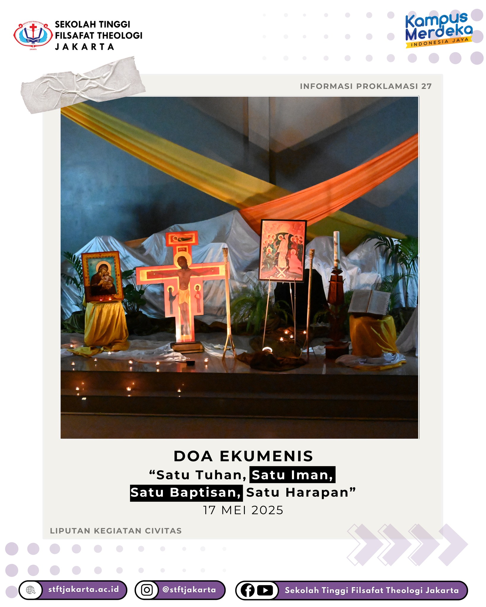 Jakarta, 17 Mei 2025 — STFT Jakarta menggelar Doa Ekumenis bertema “𝗦𝗮𝘁𝘂 𝗧𝘂𝗵𝗮𝗻, 𝗦𝗮𝘁𝘂 𝗜𝗺𝗮𝗻, 𝗦𝗮𝘁𝘂 𝗕𝗮𝗽𝘁𝗶𝘀𝗮𝗻, 𝗦𝗮𝘁𝘂 𝗛𝗮𝗿𝗮𝗽𝗮𝗻” (Efesus 4:5), yang diikuti oleh civitas akademica dan 37 sinode gereja, termasuk perwakilan Gereja Ortodoks.