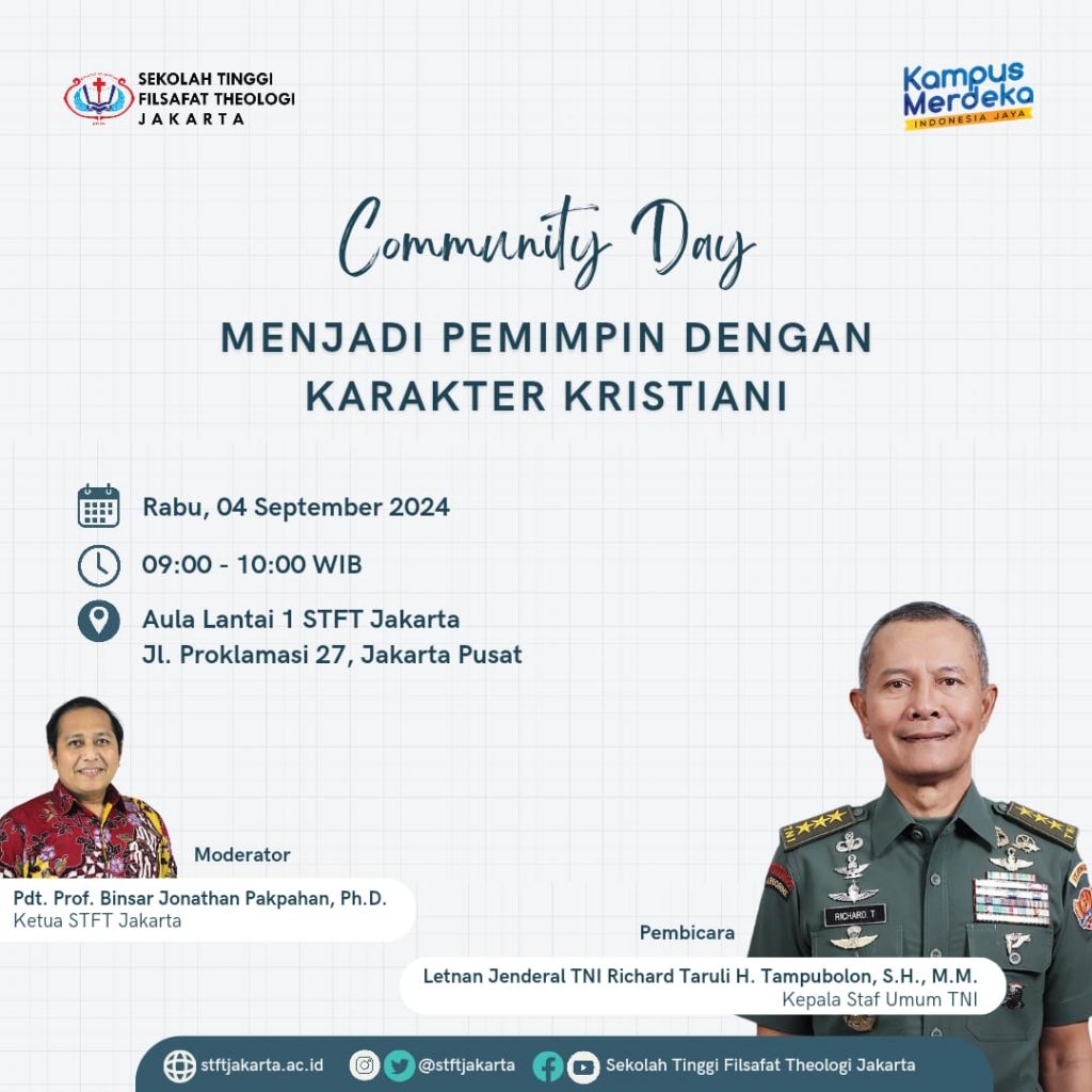 Sivitas STFT Jakarta diundang untuk mengadiri Community Day STFT Jakarta pada:Rabu, 04 September 2024, pkl. 09:00 - 10:00 WIB di