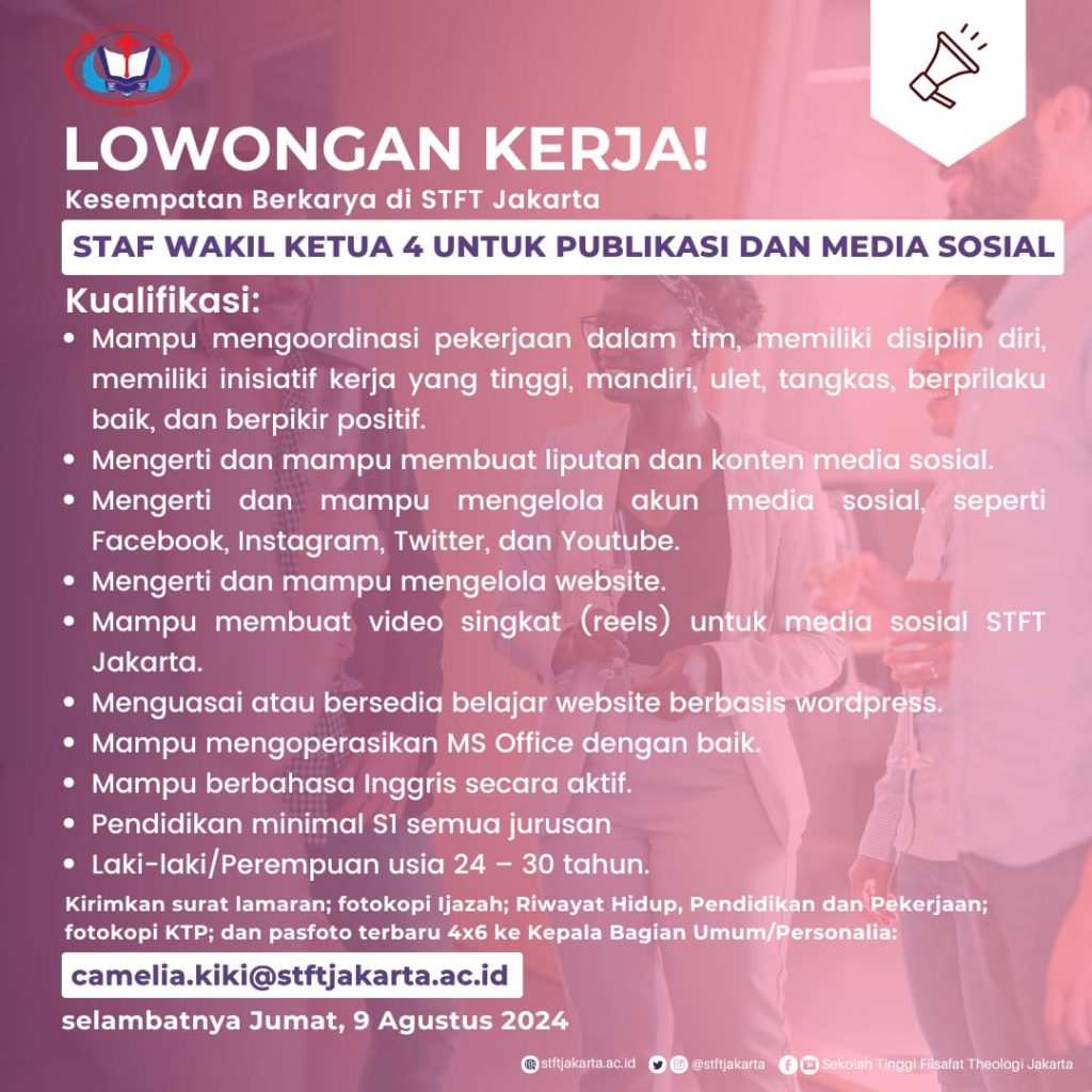 STFT Jakarta memberikan kesempatan bekerja sebagai posisi Staf Wakil Ketua 4 untuk Publikasi dan Media Sosial. Ketentuan, kualifikasi, serta dokumen