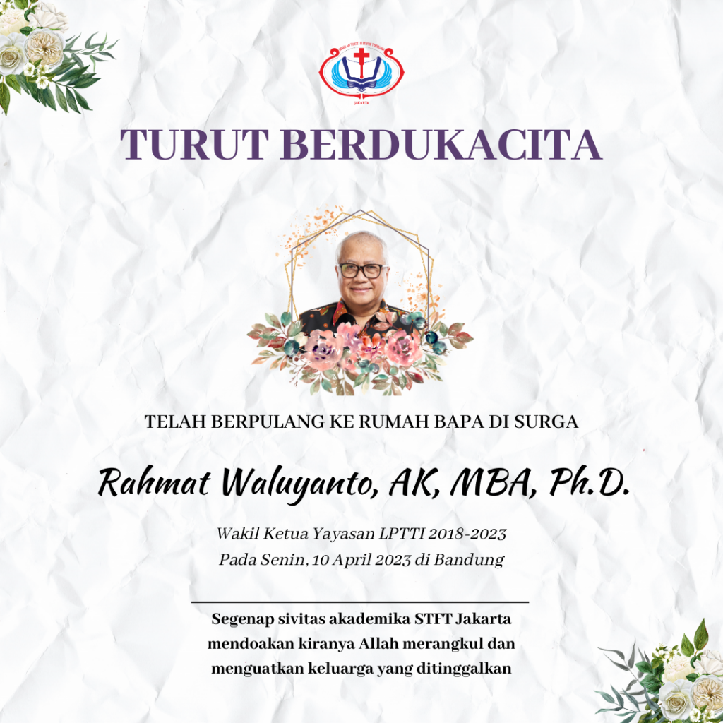 Segenap civitas Sekolah Tinggi Filsafat Theologi Jakarta mengucapkan turut berdukacita atas berpulangnya Bapak Rahmat Waluyanto, AK, MBA, Ph.D. (Wakil Ketua