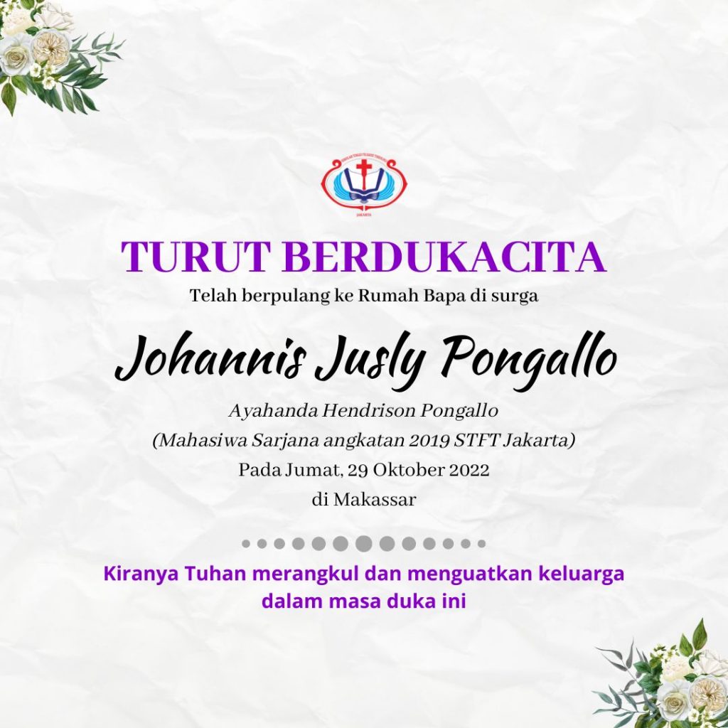 Telah kembali ke Rumah Bapa di Surga, Johannis Jusly Pongallo, Ayahanda Hendrison Pongallo, Mahasiswa program sarjana angkatan 2019 STFT Jakarta.